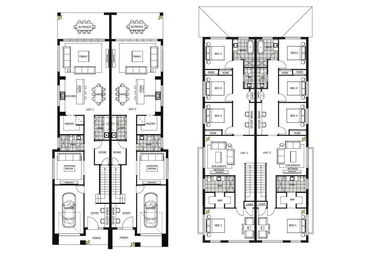 The Elmwood is a spacious 5-bedroom duplex designed to meet NSW CDC standards, combining modern elegance with functional living. The ground floor features a welcoming foyer, a versatile front room, a convenient guest bedroom, and a generous open-plan living area that integrates the living room, dining area, and modern kitchen with high-quality appliances and an island bench. Large sliding doors lead to a private patio, perfect for outdoor dining. Upstairs, the master suite boasts a walk-in wardrobe and stylish ensuite, while three additional bedrooms with built-in wardrobes share a well-appointed family bathroom. An additional living area provides a versatile space for relaxation or entertainment. The Elmwood's design offers a flexible layout suited to contemporary family lifestyles.