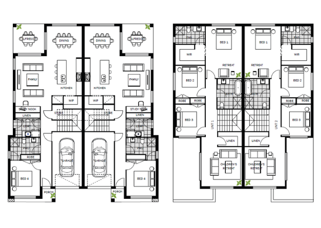 The Maple duplex, designed for a 17m block and compliant with NSW CDC standards, offers a blend of modern elegance and functional efficiency. The ground floor features a front bedroom suitable as a guest room or home office and an expansive open-plan living area at the rear, seamlessly integrating the living room, dining space, and stylish kitchen with high-quality appliances and ample storage. Sliding doors lead to a private, landscaped patio, enhancing the indoor-outdoor living experience. Upstairs, the master suite offers a walk-in wardrobe and ensuite, while two additional bedrooms with built-in wardrobes share a contemporary family bathroom. A versatile children's living area provides extra space for various activities. The Maple's design maximizes space and comfort, making it ideal for modern family living.